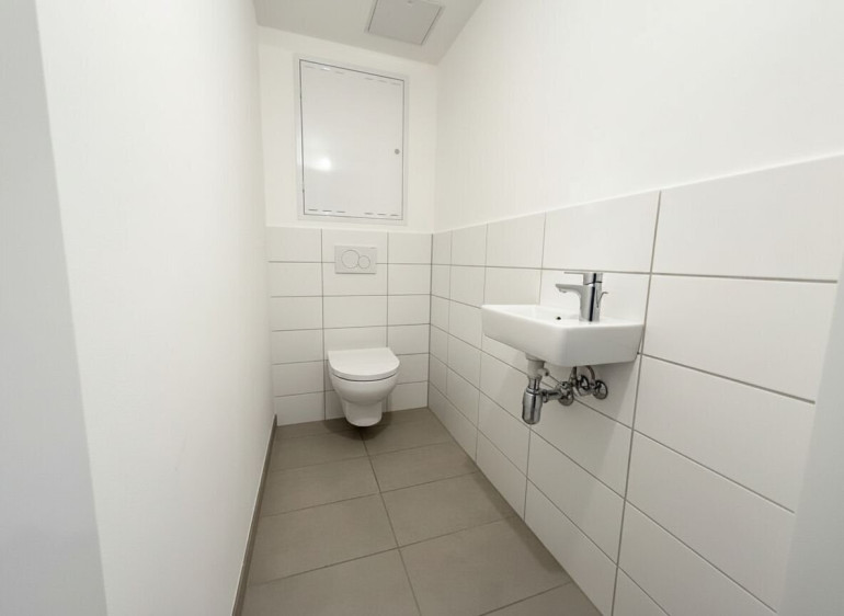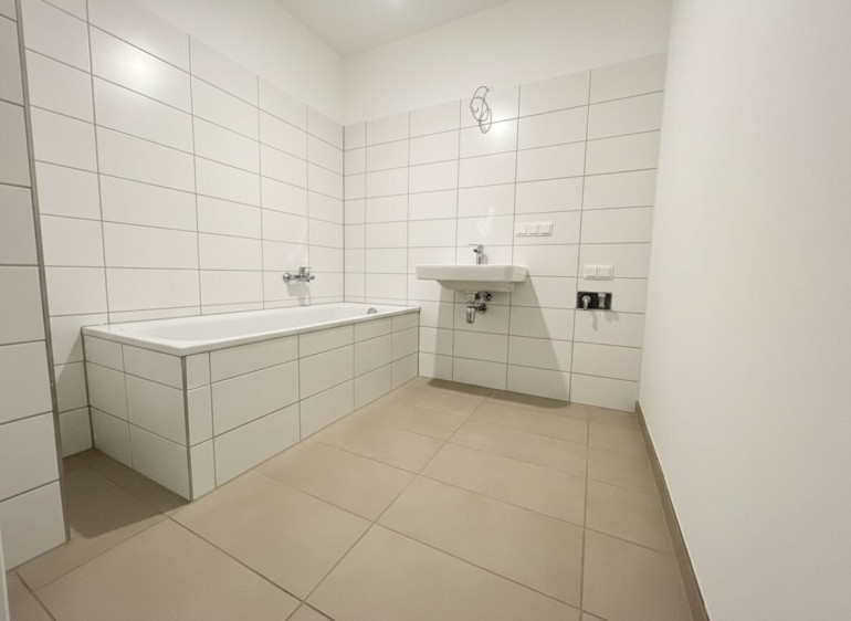 Das Badezimmer ist modern verfliest und mit einer Badewanne ausgestattet. Des Weiteren befinden sich ein Handwaschbecken und ein Waschmaschinenanschluss im Badezimmer. Das WC ist ebenfalls modern verfliest und separat, neben dem Badezimmer vorzufinden.