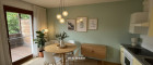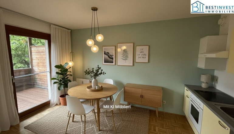 Die Küche mit Essbereich befindet sich in einem eigenen Raum welcher mit dem Wohnzimmer eine tolle Einheit bildet. Von hier aus gelangt man auch auf die große, vollständig überdachte Terrasse mit Abendsonne.
