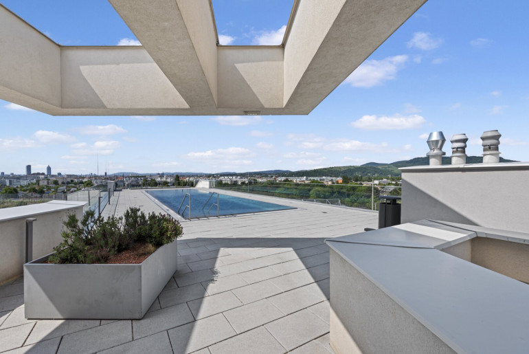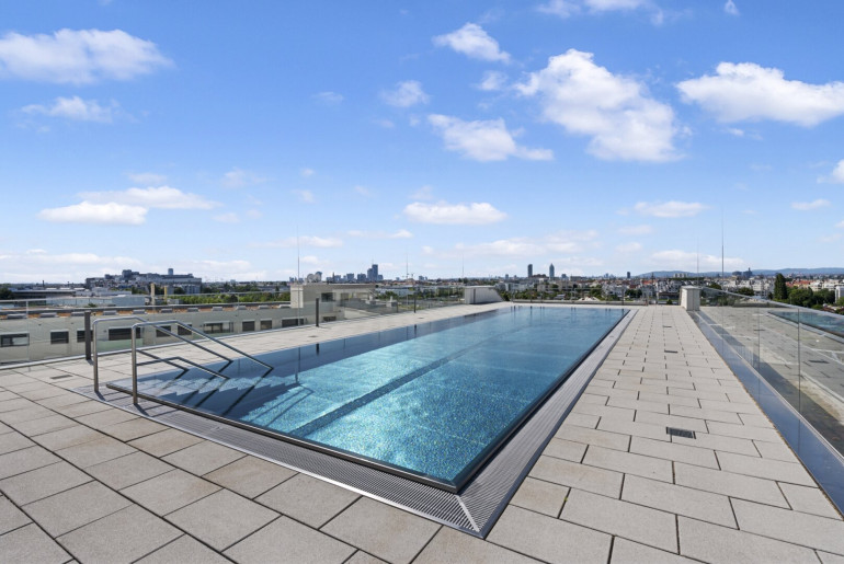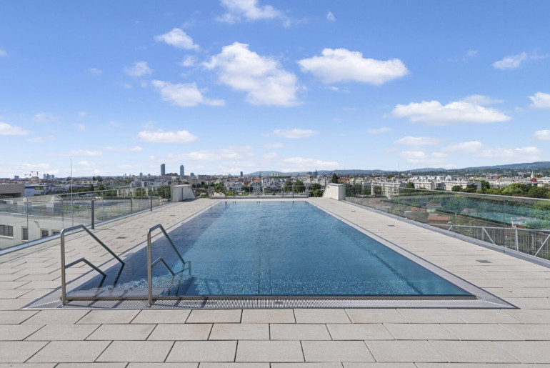-) Wohnen in einer sehr internationalen und modernen Anlage (Pool am Dach, Saunabereich,
