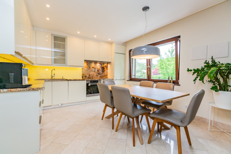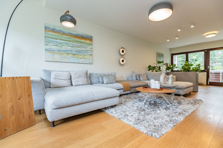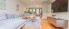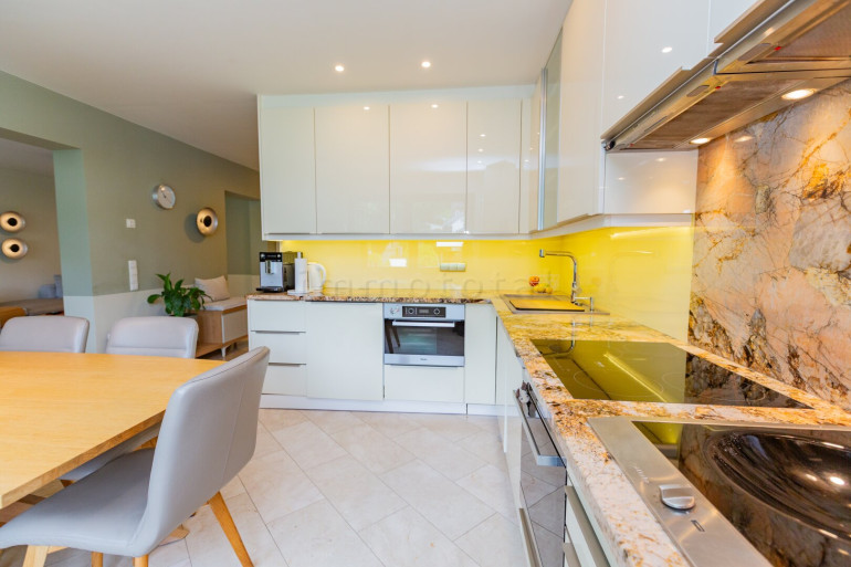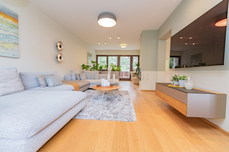 Im Jahr 2019 wurde die Wohnung aufwendig und stilvoll saniert: Die offen gestaltete Wohnküche ist mit einer hochwertigen HAKA-Einbauküche samt Miele-Geräten und Induktions-Wok-Mulde ausgestattet. Der Essbereich bildet eine gelungene Verbindung zum weitläufigen Wohnzimmer und betont den offenen Wohncharakter der Wohnung. Das moderne Bad mit Walk-in-Dusche und Badewanne, ein offener Kamin im Wohnzimmer sowie durchdachte, designorientierte Ausstattungselemente verleihen der klimatisierten Wohnung eine exklusive Atmosphäre.