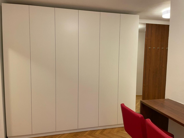 Der Vorraum ist komplett mit einem Tischlerschrank ausgestattet und bietet dadurch die Möglich sämtliche Kleidung, Schuhe, Gegenstände, usw. problemlos zu verstauen und unterzubringen. Integriert sind ebenfalls Garderobe mit Spiegel.