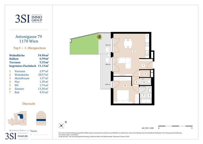 Diese moderne Wohnung verfügt über ca. 54 m² Wohnfläche, ca. 16 m² Terrasse/Balkon und ca. 11 m² begrüntes Flachdach. Sie besticht durch ihren durchdachten Grundriss und teilt sich wie folgt auf: