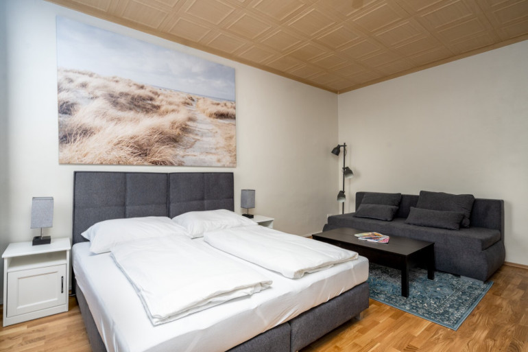 Das großzügige Zimmer ist der perfekte Rückzugsort, um nach einem langen Tag zu entspannen. Dank der großen Fenster wird der Raum mit natürlichem Licht durchflutet, was für eine angenehme Atmosphäre sorgt.