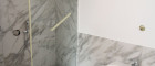 Direkt nebenan befindet sich das moderne Badezimmer, das mit einer komfortablen Dusche, stilvollen Fliesen und Waschmaschinenanschluss ausgestattet ist.