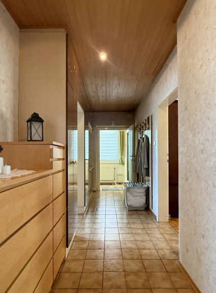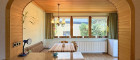 Betritt man das Haus, schreitet man durch einen klassischen Windfang, als würde man durch eine unsichtbare Schwelle in eine andere Zeit treten. Links ein Gang ins Wohnzimmer, wo das großes Blumenfenster den Blick auf den Garten freigibt, immer Ihre Kinder im Fokus.