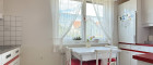Vis-à-vis vom Wohnzimmer liegt die Küche, die mit einem Augenzwinkern an Oma erinnert: klein, mit Rüscherl-Vorhängen, die Geschichten von längst vergangenen Tagen erzählen, und einem kleinen Sitzplatz für den schnellen Kaffee-Tratsch. Ein Platz mit Blick auf die Straße, immer alles genau im Visier.
