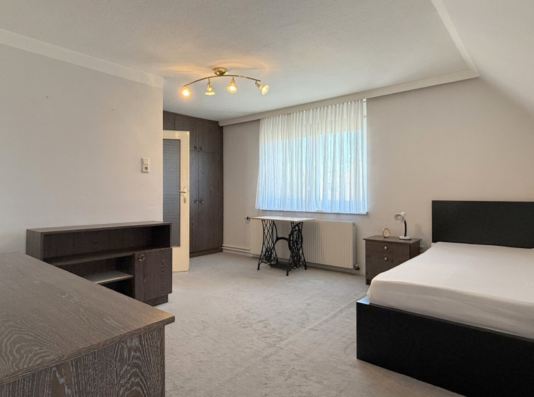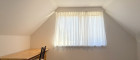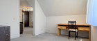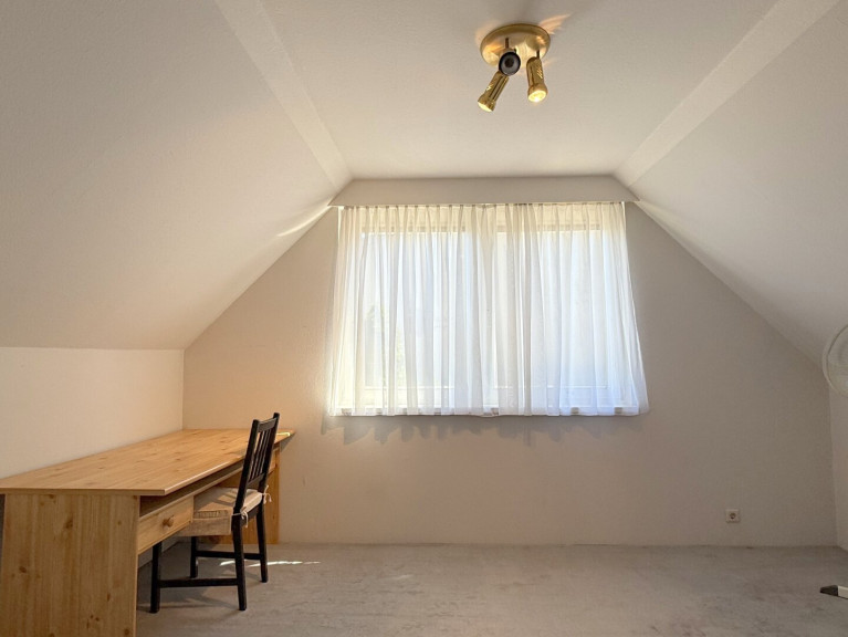 Auf der einen Seite ein großes, geradliniges Zimmer ohne Schrägen, mit dem Blick hinaus auf Felder, Garten und den Tag, der irgendwo da hinten langsam beginnt. Ein Raum für Ruhe, Ordnung – oder auch für das Chaos, das manchmal dazugehört.