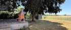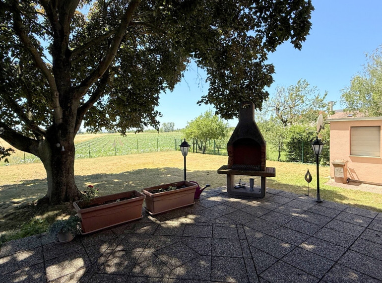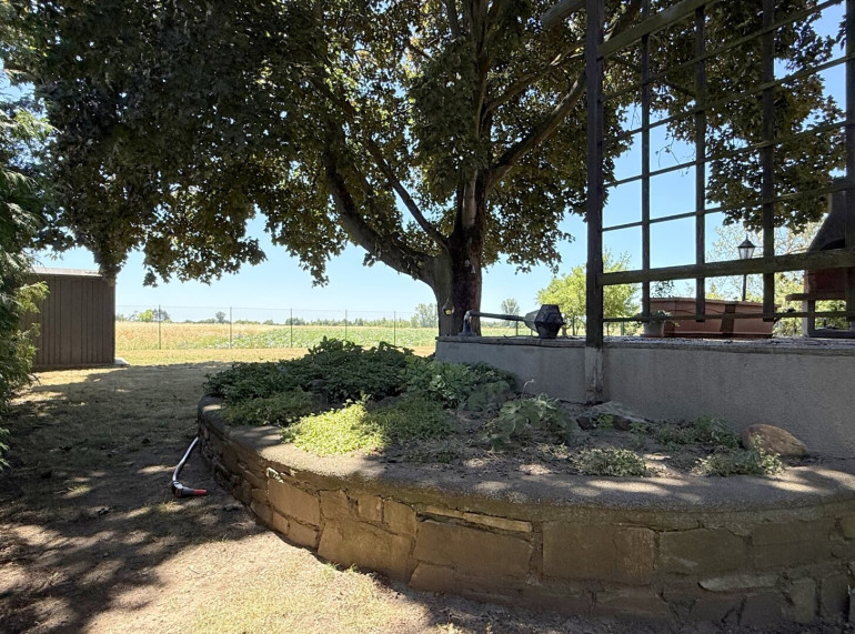 Dahinter öffnet sich der Garten in sanfter Weite, eben und großzügig, mit einem mächtigen Blutahorn, der als stiller Wächter Schatten spendet. Das Feld hinter dem Garten scheint fast grenzenlos, hier fühlt man fast das Marchfeld mit jedem Atemzug. Gemüse wird vom Bauern gepflanzt und am Horizont färbt der Kahlenberg die Abendsonne in ein warmes Rot.