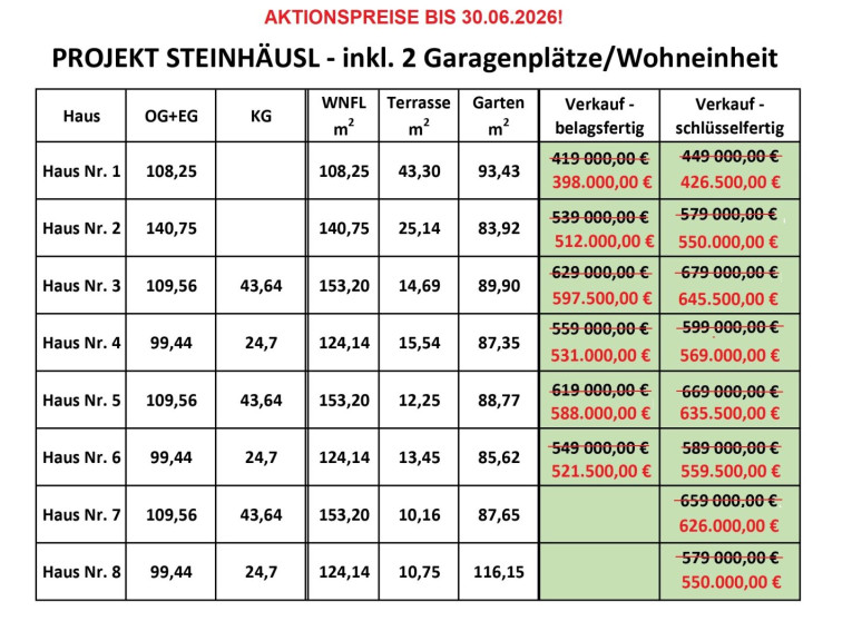 Die Häuser 7 und 8 sind bereits schlüsselfertig errichtet worden, die Häuser 1 bis 6 können wahlweise belagsfertig oder schlüsselfertig nnerhalb der nächsten 3 Monaten übernommen werden. Für detaillierte Informationen stehe ich Ihnen gerne jederzeit telefonisch zur Verfügung.