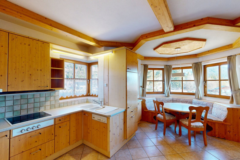 - Großzügiger Wohn-Ess-Bereich mit Kachelofen (Sichtfenster), Einbauküche & gemütlicher Eckbank