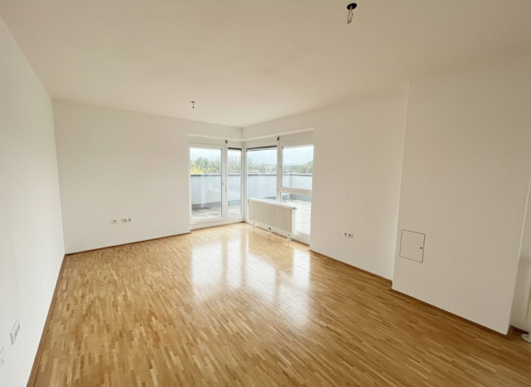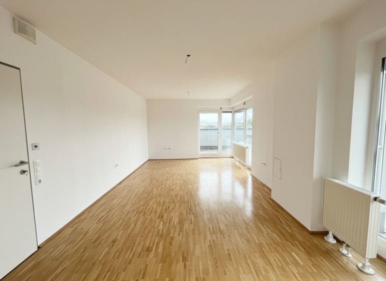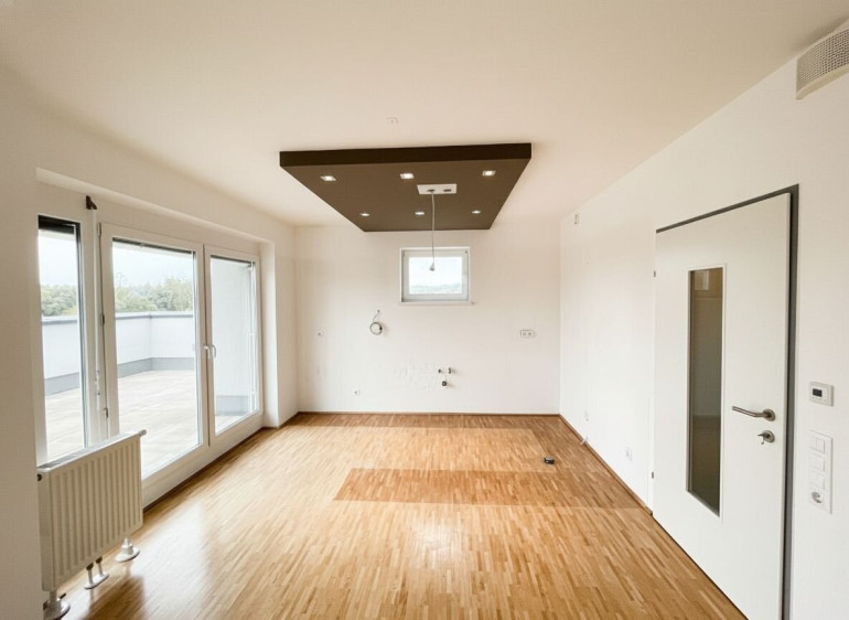Die großzügige Wohnküche mit direktem Ausgang auf den Balkon bildet das Herzstück der Wohnung. Die Fensterflächen sorgen für viel Licht und schaffen eine freundliche, offene Atmosphäre.