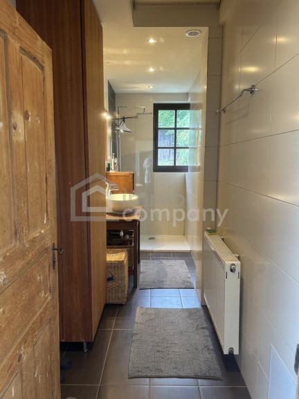 Dielenboden, Fliesen, Heizofen, Zentralheizung, Einbauküche, Wohnküche / offene Küche, Bad mit Fenster, Badewanne, Dusche, Carport