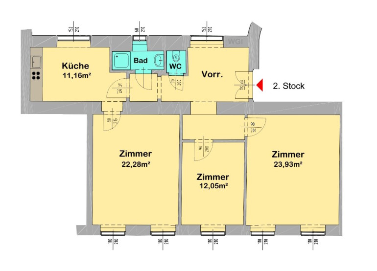 Einziger Nachteil der Lage im 2. Stock ist das Fehlen eines Lifts. Die Räumlichkeiten sind nur über das Stiegenhaus erreichbar.