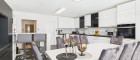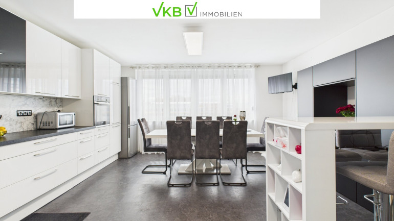 Der große lichtdurchflutete Koch/Essbereich, mit imposanter Einbauküche aus dem Hause DAN-Küchen und der angrenzenden Bartheke ist nur einer von vielen Höhepunkten, die diese Wohnung zur besonderen Art und Weise macht.