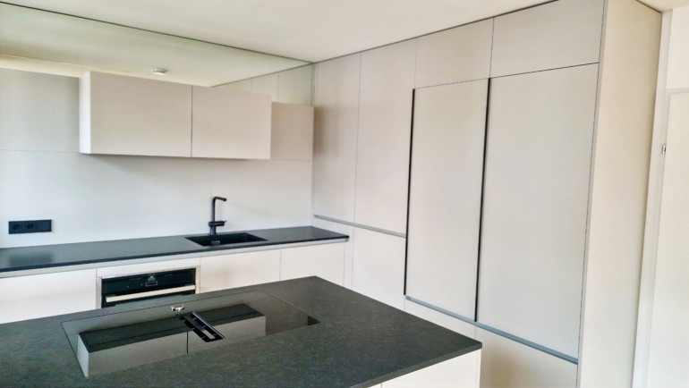 Moderne, hochwertige Einbauküche mit eleganter Stein-Arbeitsplatte