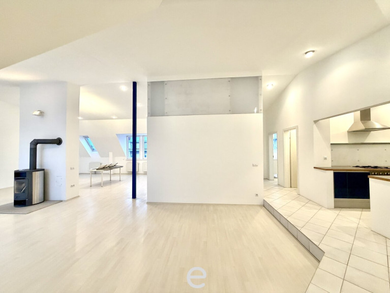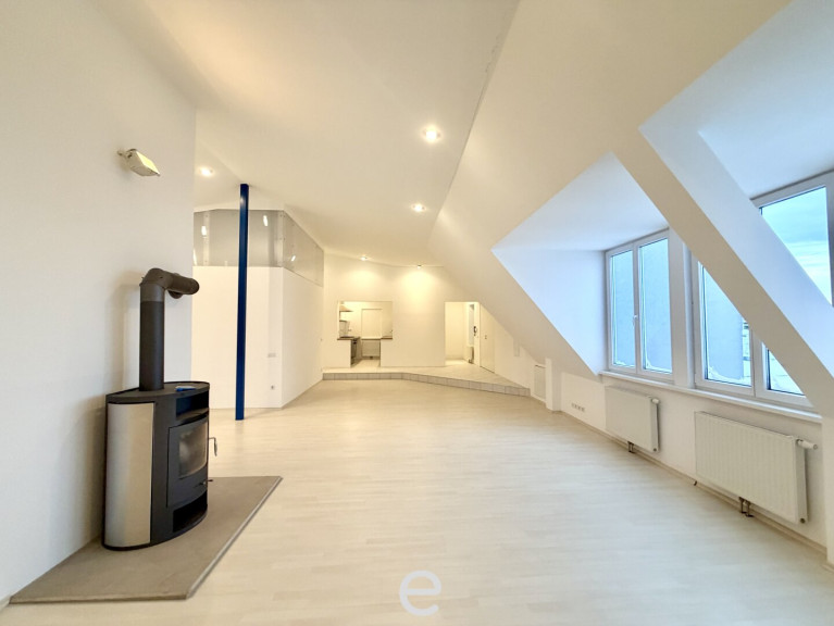 Die Wohnung besticht durch ihren durchdachten, offenen Grundriss, beeindruckende Raumhöhen von bis zu 4 Metern und eine angenehme, luftige Atmosphäre. Großzügige Dachflächenfenster auf beiden Seiten sorgen ganztägig für besonders viel Tageslicht und unterstreichen den hellen, weitläufigen Charakter der Räume. Herzstück ist der großzügige Wohn- und Essbereich mit Kamin, der fließend in die offene Küche übergeht. Darüber hinaus verfügt die Wohnung über ein Badezimmer mit Badewanne und Dusche, ein separates WC, einen Heizraum, integrierte Deckenspots sowie außenliegende Rollläden im Wohn- und Schlafzimmer. Der Lift fährt direkt ins Dachgeschoss und erschließt die Wohnung barrierefrei und exklusiv.