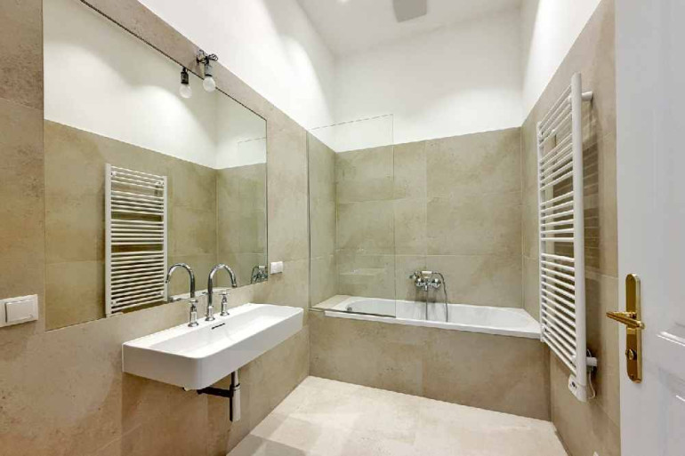 Das stilvolle Badezimmer ist mit großformatigen Fliesen verkleidet und verfügt über eine Badewanne. Ein besonderes Highlight ist die hochwertige Armatur im viktorianischen Stil: Verchromte Oberflächen, klassische Kreuzgriffe und feine Keramikelemente verleihen dem Raum zeitlose Eleganz und einen Hauch von Luxus – perfekt für ein anspruchsvolles Wohnambiente.
