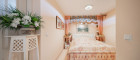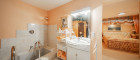 Über eine Holztreppe gelangt man in den oberen Bereich des Hauses, wo sich die offene Galerie befindet. Von dort erreicht man das elegante Badezimmer, dieses mit einer Badewanne, einen Waschtisch aus Marmor, einer Toilette und mit weißen Möbel vom Tischler ausgestattet ist. Rechts vom Badezimmer gelangt man in das großzügige Schlafzimmer, ausgestattet mit einen Balkon, wo man den herrlichen Garten beim Aufstehen betrachten kann. Neben dem Schlafzimmer befindet sich ein weiteres Zimmer, dieses sich als Arbeitszimmer oder Kinderzimmer eignet.