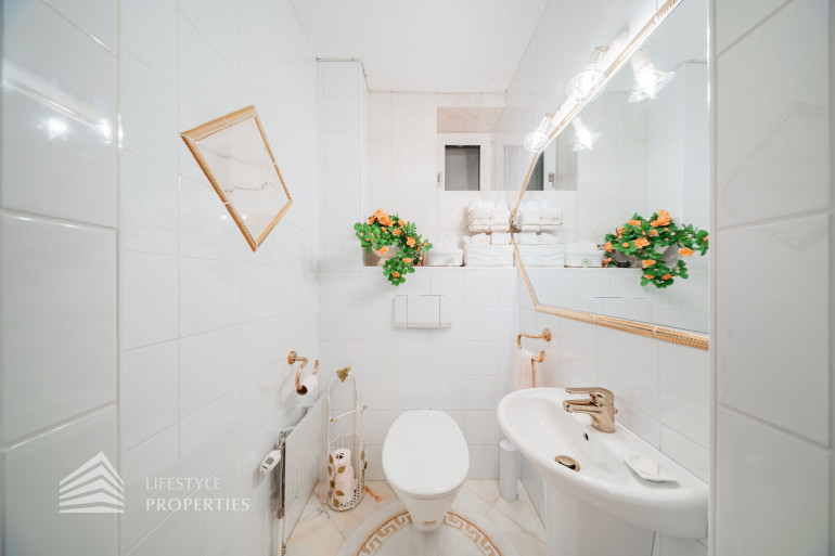 Des Weiteren verfügt die Villa über einen Wohnkeller, wo sich das Gästezimmer und der Wellnessbereich befindet. Ausgestattet mit einer finnischen Sauna und ein Kältebecken, einer Dusche, einen Waschbecken und einer separaten Toilette. Nebenan erreicht man den Wirtschaftsraum und Technikraum.