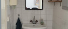 - WC- und Badbereiche mit weißen Fliesen gestaltet