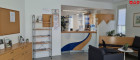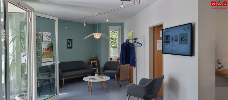 - Großzügiger Warteraum mit fest eingebautem Empfangstresen, ergänzt durch einen Plexiglasschutz für Hygiene und Sicherheit