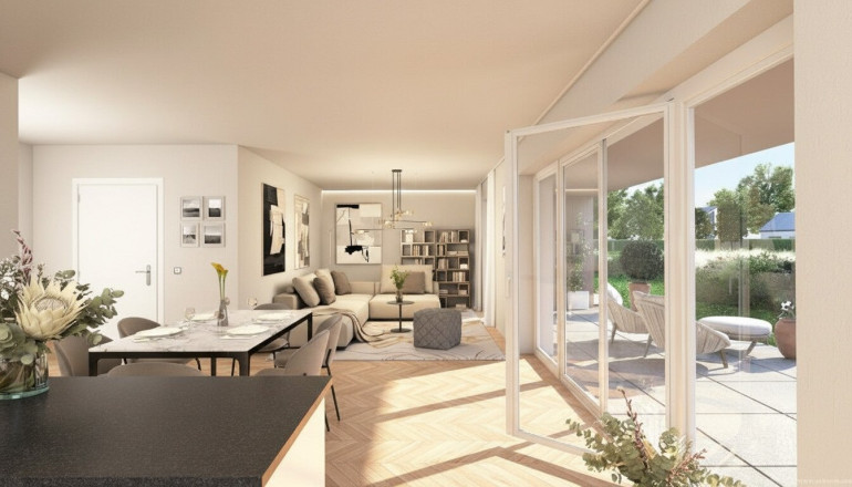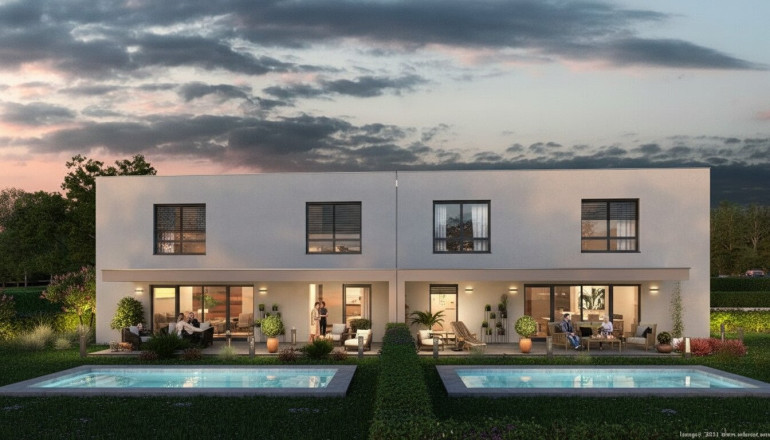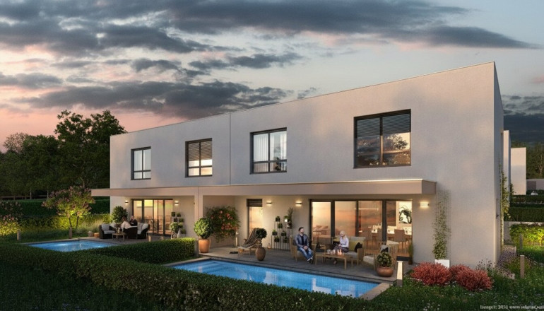 Die sonnige Südausrichtung, private Eigengärten sowie großzügige Raumhöhen von mindestens 2,60 m im Erd- und Obergeschoss sorgen für ein besonders helles und offenes Wohngefühl. Die Gärten erweitern den Wohnraum ins Freie und bieten viel Platz zum Entspannen. Auf Wunsch können in den Eigengärten der Doppelhaushälften Swimmingpools als Sonderausstattung umgesetzt werden – für zusätzlichen Wohn- und Freizeitkomfort im eigenen Zuhause.