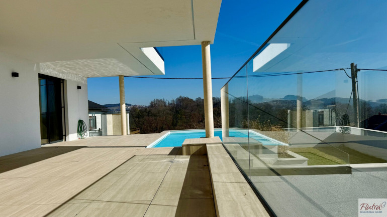 Besonders hervorzuheben ist der traumhafte Garten, der nicht nur ein privates Refugium für entspannte Stunden im Freien darstellt, sondern auch ausreichend Platz für gesellige Grillabende oder entspannte Stunden im Grünen bietet. Genießen Sie die Sonne auf Ihrer eigenen Terrasse, während Sie den atemberaubenden Fernblick über die malerische Umgebung in vollen Zügen auskosten. Dieser Außenbereich inkl. hochwertigen Pool wird schnell zu Ihrem persönlichen Lieblingsplatz.