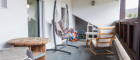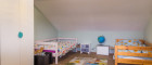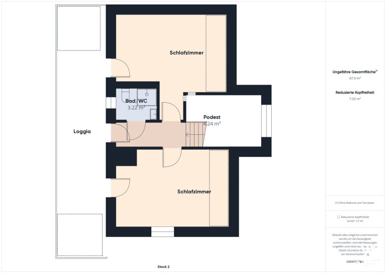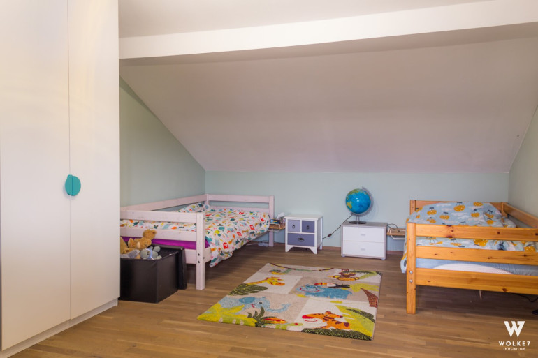 Über eine breite Holztreppe erreichen Sie das Obergeschoss, das zwei weitere Schlafzimmer sowie ein zusätzliches Badezimmer mit Dusche und WC umfasst. Die ca. 20 m² große West-Loggia ist von beiden Zimmern sowie vom Flur aus zugänglich. Sichtbare Holzbalken verleihen den Räumen eine besondere Wohnatmosphäre.