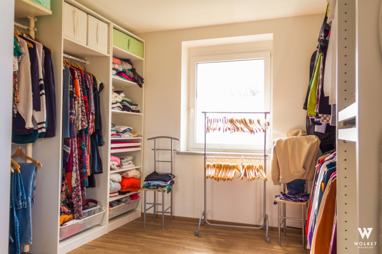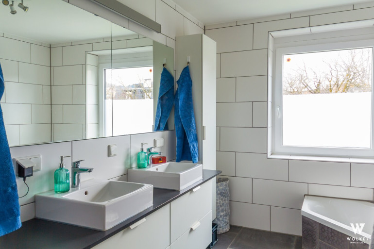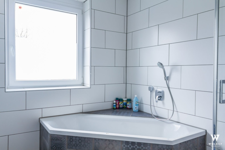 Ein großzügiges Schlafzimmer mit begehbarem Kleiderschrank und separatem Ankleidezimmer, ein stilvolles Badezimmer mit Badewanne, Dusche, Doppelwaschtisch und Handtuchwärmer sowie ein WC runden das Erdgeschoss ab.