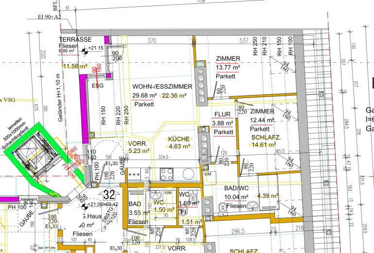 Parkett, Etagenheizung, Fußbodenheizung, Einbauküche, Wohnküche / offene Küche, Personenaufzug, Südbalkon, Bad mit Fenster, Dusche