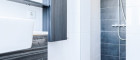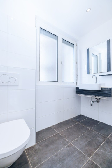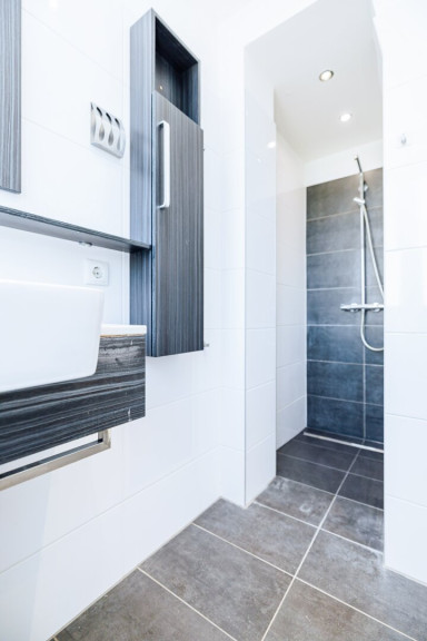 Das Badezimmer besticht durch zeitgemäßes Design und eine hochwertige Ausstattung. Hier können Sie in entspannter Atmosphäre den Tag beginnen oder ihn ausklingen lassen. - Praktischer Abstellraum mit Waschmaschinenanschluss