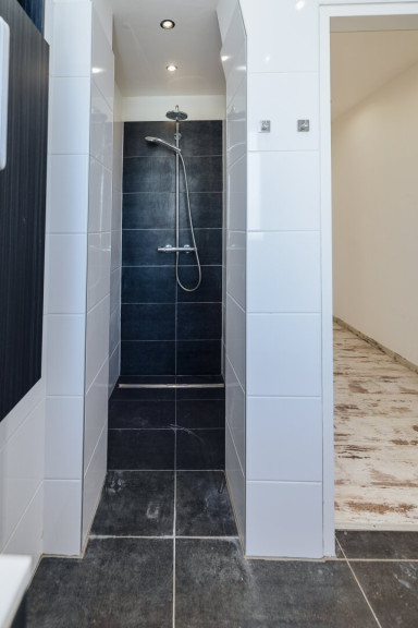 Das moderne Badezimmer ist mit einer eleganten Dusche ausgestattet und lädt zum Erfrischen und Wohlfühlen ein. Abgerundet wird das Angebot durch einen praktischen Abstellraum, der neben zusätzlichem Stauraum auch einen Waschmaschinenanschluss bietet – ein Komfort, den man im Alltag schnell zu schätzen weiß.