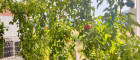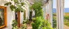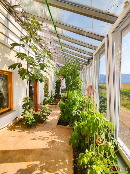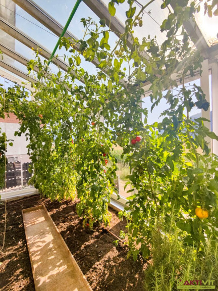 Ein Gewächshaus mit automatisierter Steuerung für Bewässerung, Lüftung und Heizung erlaubt ganzjährigen Anbau. Die Gartenpflege wird durch ein unterirdisches Bewässerungssystem unterstützt.