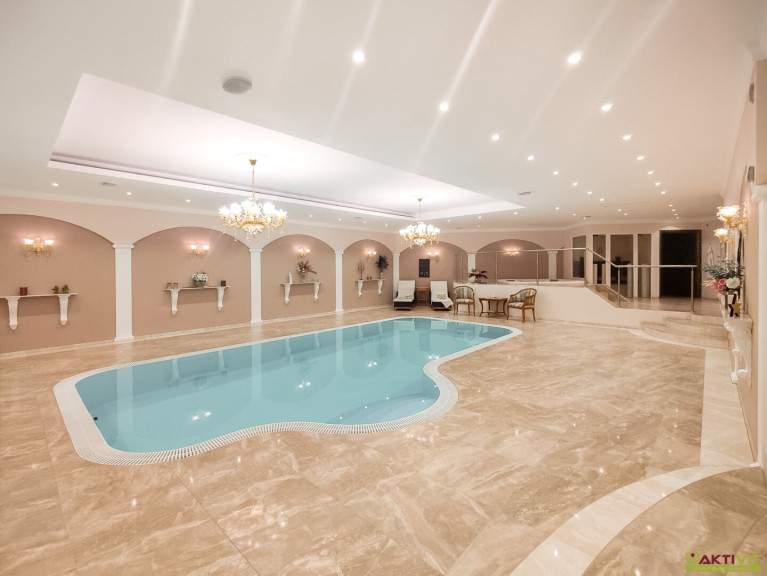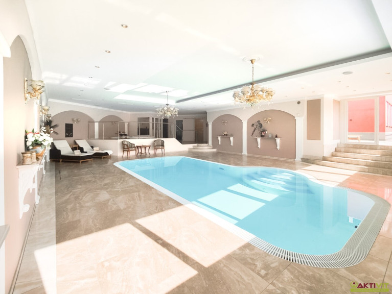 Der Wellnessbereich im ausgebauten Kellergeschoss ist ein echtes Highlight. Auf höchstem Niveau ausgestattet, bietet er ein 42 m² großes Hallenbad mit farblich steuerbarer Unterwasserbeleuchtung, ein Dampfbad mit Kneippfunktion, einen Whirlpool sowie eine Infrarotkabine aus Naturholz. Die gesamte Lichtführung im Wellnessbereich ist stimmungsvoll inszeniert und per Fernbedienung steuerbar. Auch hier sorgen Deckenlautsprecher für ein vollständiges audiovisuelles Entspannungserlebnis. Edle Stuckarbeiten und Naturmaterialien unterstreichen den exklusiven Charakter dieser Wohlfühlzone.