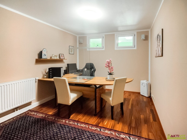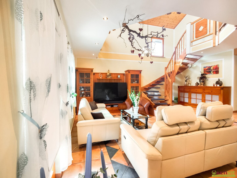 Das Wohnhaus erstreckt sich über drei Ebenen: Erdgeschoss, Obergeschoss sowie einen ausgebauten Kellerbereich. Im Erdgeschoss liegt der offene Wohn- und Essbereich mit hochwertiger Einbauküche, ein separates Gäste-WC sowie das großzügige Wohnzimmer mit Galerie und direktem Zugang zur überdachten Terrasse.