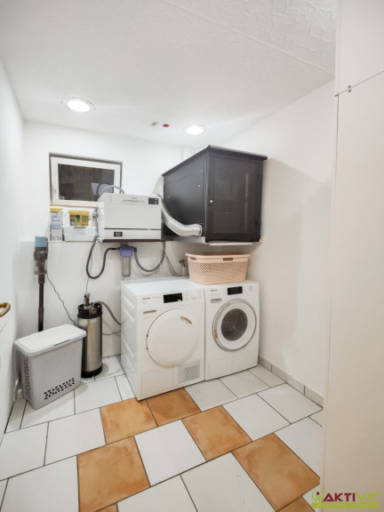 Der ausgebaute Keller bietet neben Technik- und Lagerräumen auch ein großzügiges Archiv, einen Hobbyraum sowie den exklusiven Wellnessbereich mit Hallenbad (42 m² Wasserfläche), Whirlpool, Dampfbad, medizinisch ausgestatteter Infrarotkabine, Dusche und WC.