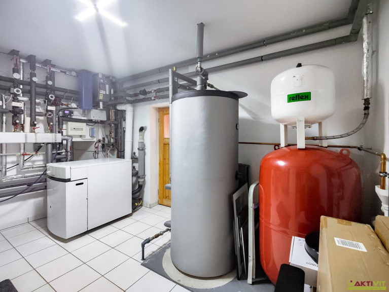Die Fenster im Wohnbereich bestehen aus 2-fach verglastem Holz, in Gewerbebereich und Hallenbad aus 3-fach verglastem Kunststoff. Die Beheizung erfolgt über eine Kombination aus Solarthermie, einem Kachelofen mit Heizfunktion, Fußbodenheizung und einem 3.800 Liter Heizöltank im Garten.