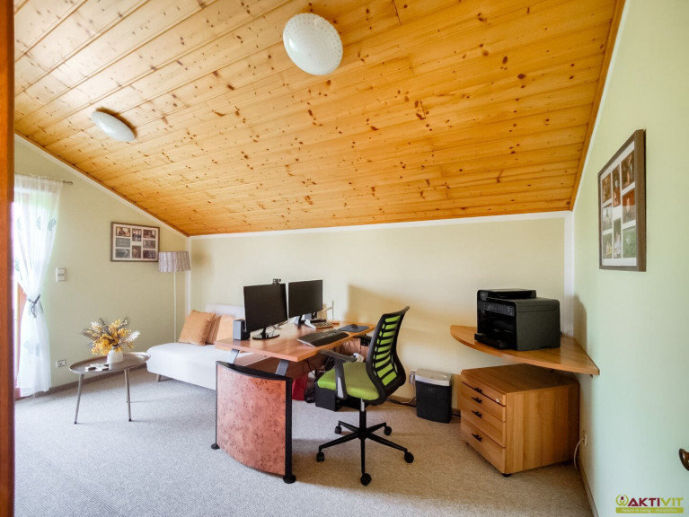Im Obergeschoss sind drei Schlafzimmer sowie ein zentrales Badezimmer untergebracht. Die Zimmer sind über eine Galerie erschlossen.