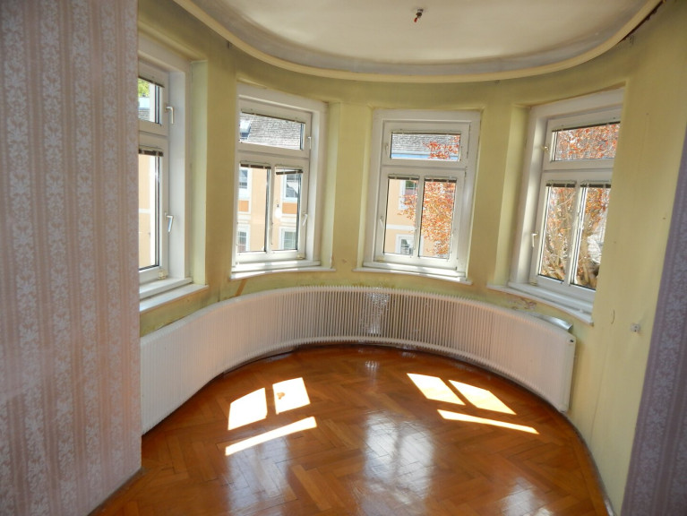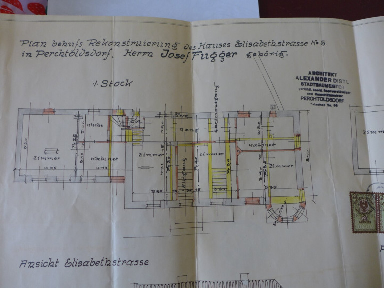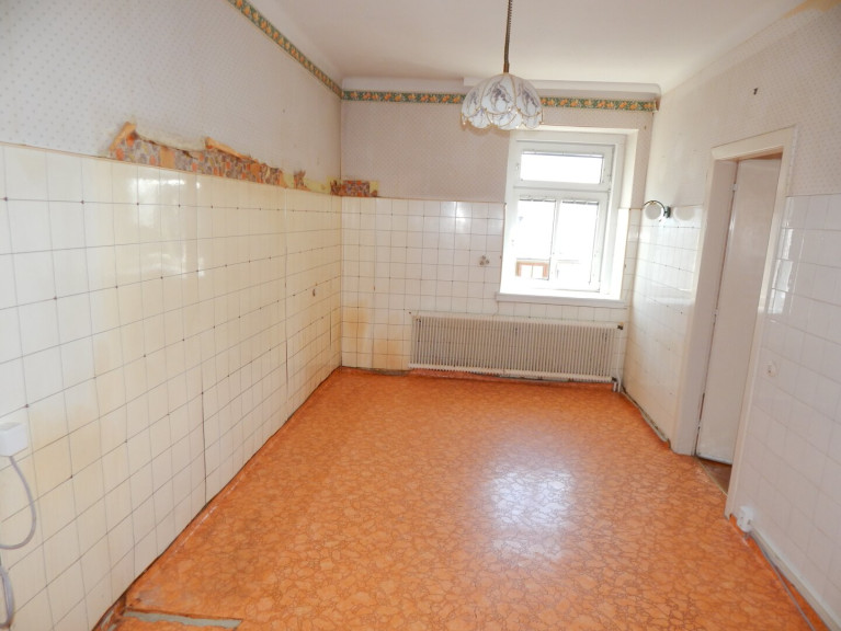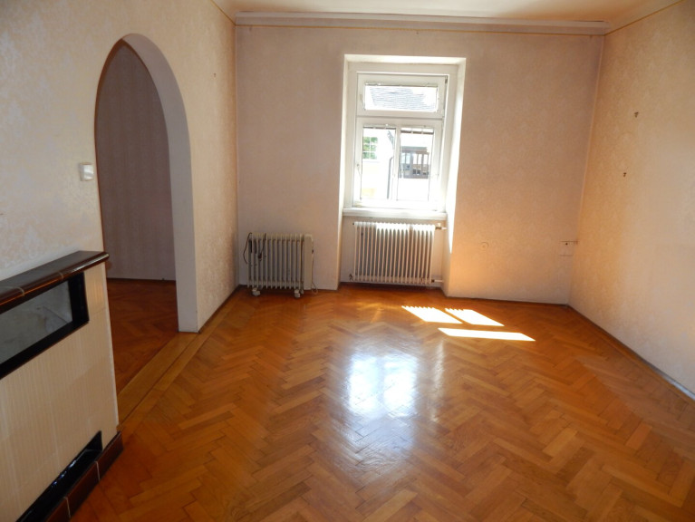 Im ersten Stock erwartet Sie ein großzügiges Wohnzimmer mit rundem Erker und Kamin, ein großer Raum für die Küche, drei Zimmer, ein Kabinett, ein Badezimmer mit Dusche, Toilette sowie Aufgang zum Dachboden.