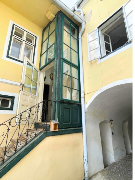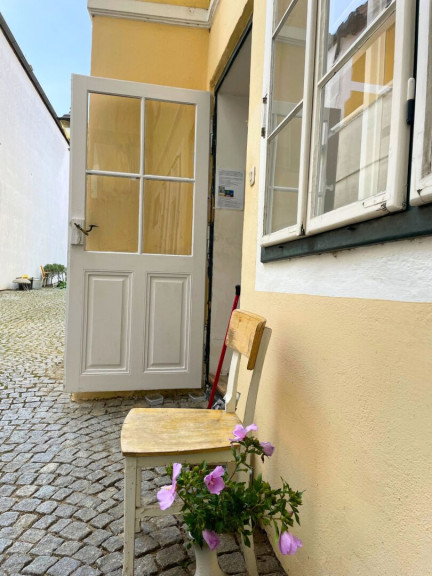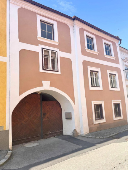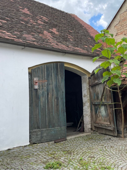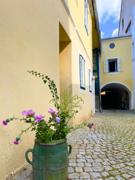 Hinter der schlichten Fassade verbirgt sich eine eigene Welt: ein rund 1.000 m² großes Grundstück mit zwei historischen Gebäuden – eines aus dem 14. Jahrhundert, eines aus dem 19. Jahrhundert – verbunden durch einen 30 Meter langen, gepflasterten Innenhof, an dessen Ende ein grosses Stadlgebäude mit alter Weinpresse steht.Dahinter ein kleiner verwunschener, ruhiger Garten mit Altbaumbestand.