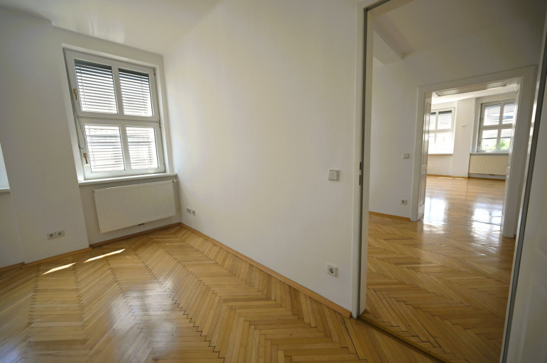 Drei lichtdurchflutete Zimmer mit hochwertigem Parkett schaffen eine angenehme, repräsentative Arbeitsatmosphäre. Große Fensterfronten sorgen für optimale Belichtung und eröffnen einen beeindruckenden Blick über die Stadt.