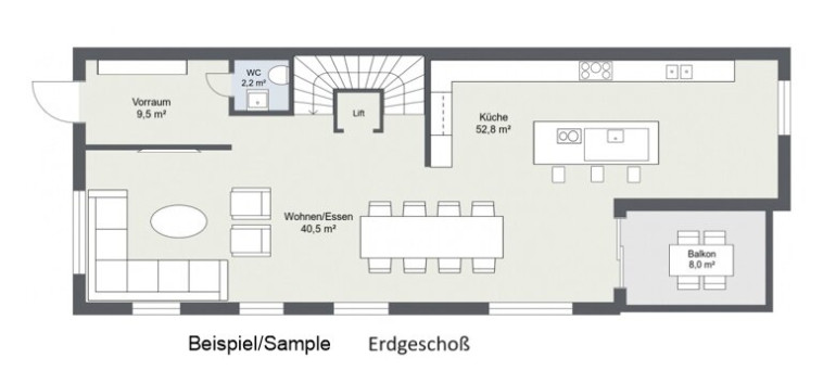 Dem Wohn und Ess- Bereich, wird dank hoher Raumhöhe (3m), ein angenehmes Ambiente verliehen und lässt dank großzügiger Raumplanung, jede erdenkliche Küchenausführung (z.B freistehende Kücheninsel) zu.