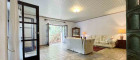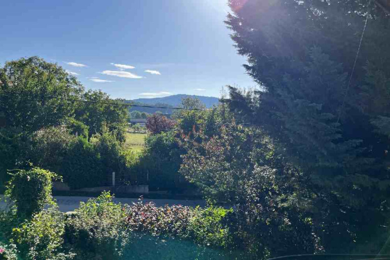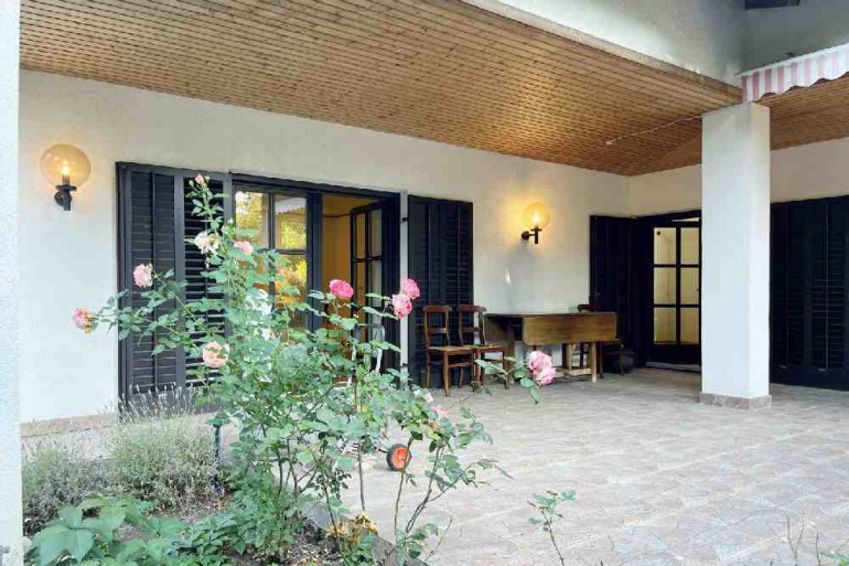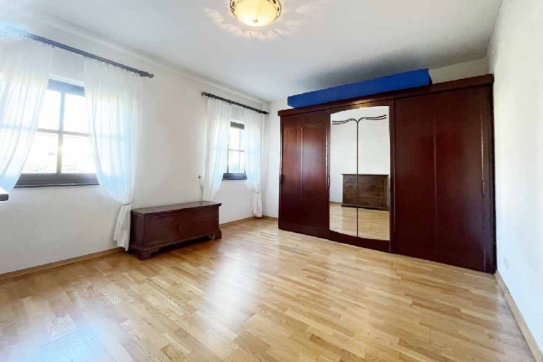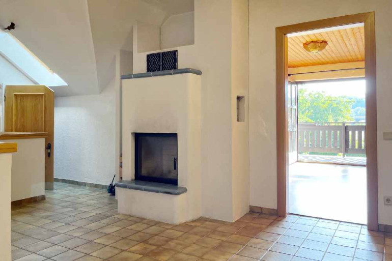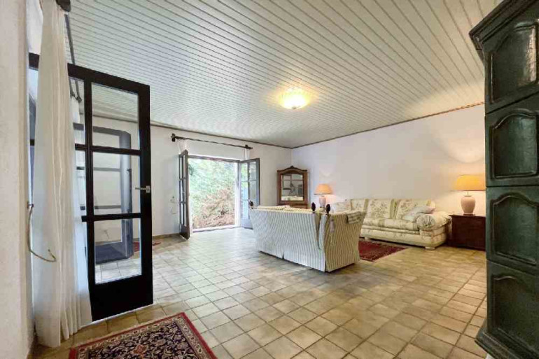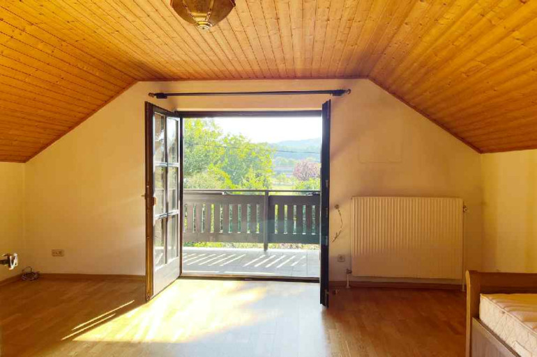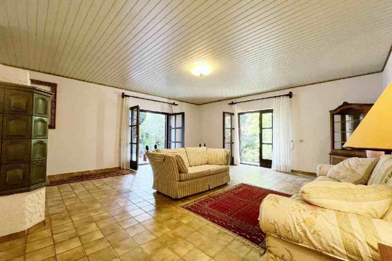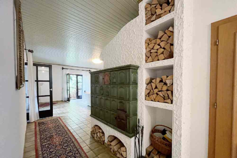 Vorbei an einem sehr schönen Kachelofen gelangen Sie in den Wohnbereich, wo zwei Ausgänge auf die Terrasse eine perfekte Verbindung zwischen Innen- und Außenbereich schaffen. Ein weiteres Schlafzimmer sowie ein Badezimmer vervollständigen das Erdgeschoss.