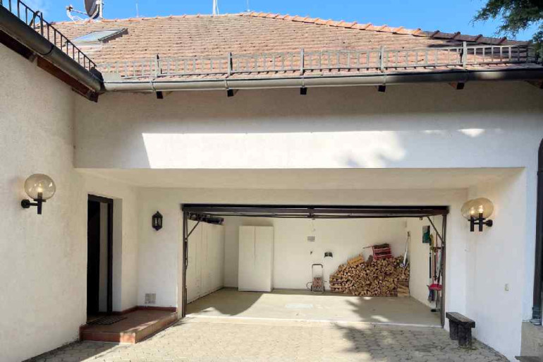 Die Garage für zwei Pkw verfügt über ein automatisches Garagentor, während zusätzlich Abstellplatz für weitere Fahrzeuge zur Verfügung stehen.