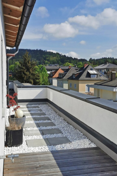 Die Dachterrasse, mit außergewöhnlichen 80 m², umschließt beinahe das gesamte Penthouse und bietet einen wundervollen Blick über die Dächer von Waidmannsdorf.