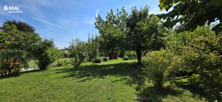 Der weitläufige Garten mit zahlreichen Obstbäumen lädt zum Garteln, Chillaxen und Wohlfühlen ein.