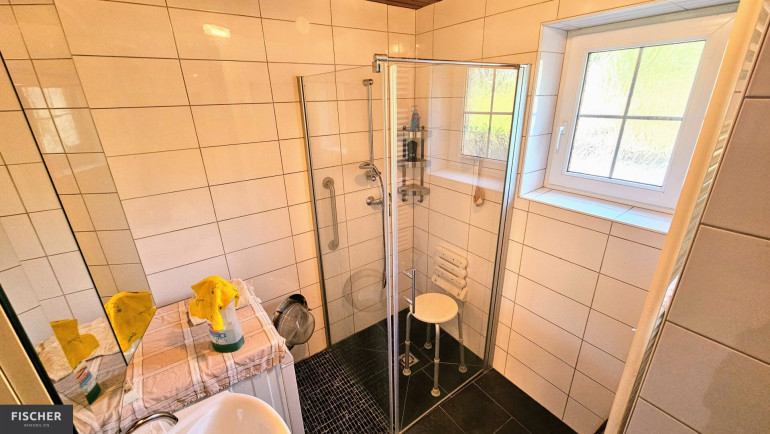 Erdgeschoß: Wohnküche / Wohnzimmer / Schlafzimmer / Kabinett-Gästezimmer bzw. Büro oder Schrankraum / Toilette / Badezimmer mit moderner Glasdusche / Südterrasse im Zugangsbereich
