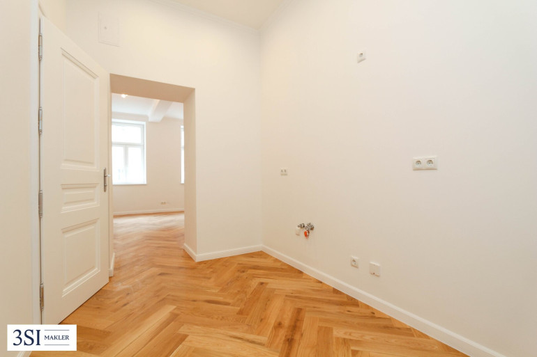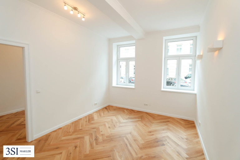 Zum Verkauf gelangt eine eben generalsanierte 3-Zimmer-Wohnung im Erdgeschoß eines klassischen Stilaltbaus.