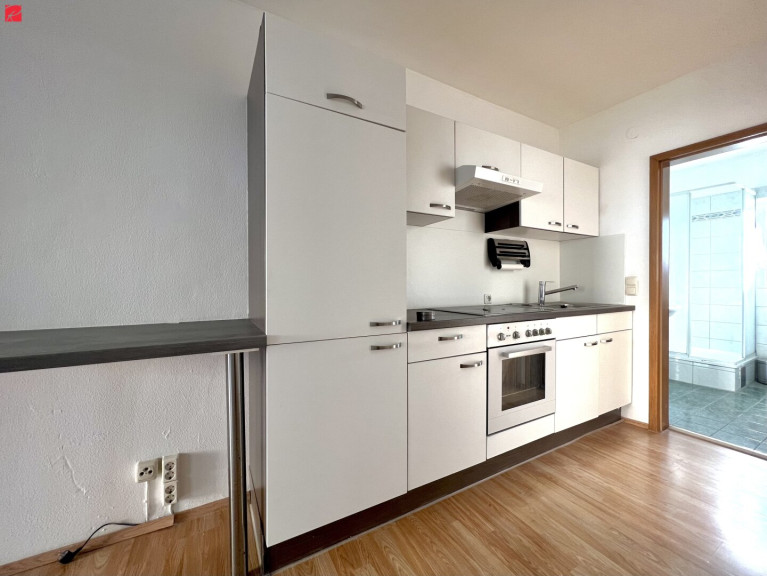 Über den Vorraum gelangen Sie in die großzügige Wohn-Essküche. Die Küche überzeugt durch ein schlichtes Design und weiße Fronten.