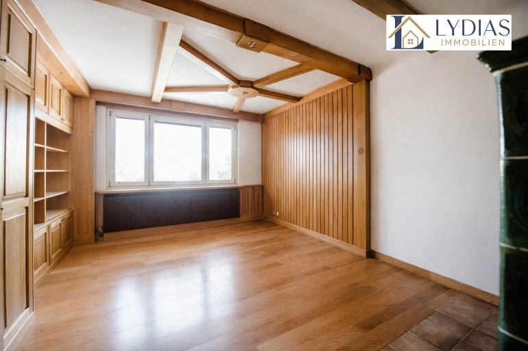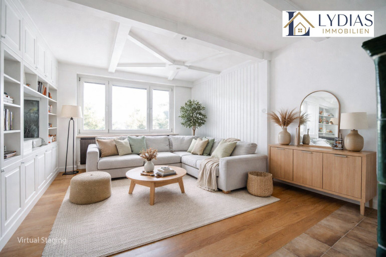 Zur Information: Die Abbildung des Wohnzimmers wurde virtuell gestaltet und dient der Veranschaulichung. Das Originalfoto finden Sie ebenfalls im Inserat.